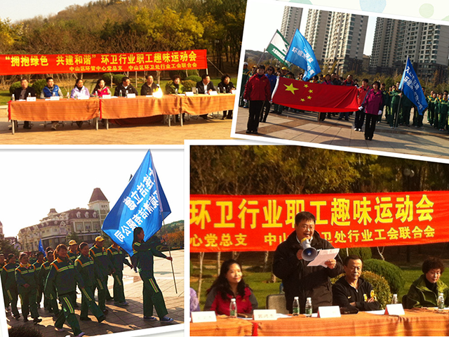 为丰富环卫职工的业余生活,培养团队合作意识,增强环卫职工队伍凝聚力,促进职工身心健康,打造和谐环卫,中山区环管中心党总支和中山区环卫处行业工会联合会于2014年10月28日,在老虎滩海洋广场举办了中山区首届主题为“拥抱绿色,共建和谐”的环卫行业职工趣味运动会。
