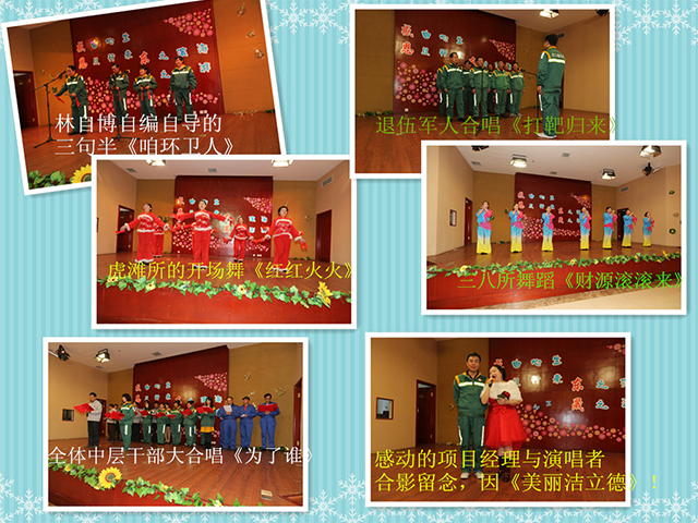 精彩纷呈的文娱晚会节目更让员工们耳目一新,虎滩所表演的集体舞蹈开门红,红红火火;三八所林自博自编自导自演的三句半“咱环卫人”超级搞笑;财源滚滚来的舞蹈也令三八所基本囊括了年会抽奖环节的大、小奖;震撼有力的打靶归来,是洁立德退役军人们表演的小合唱,职能部门美女们的阿拉伯风情舞蹈妖媚多姿,其他企业的表演也是精彩美幻,盛况超前。年会历时3小时20分,在集团全体中层干部合唱的众人划将开大船、为了谁的美好歌声中落下帷幕。—通讯员:许添慧