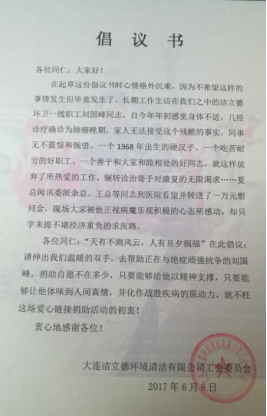 在得知刘国峰同志病情以后,董事长当即拿出了1万元慰问金送到刘国峰手里。公司工会委员会立即倡议全体员工进行一次爱心捐款,得到了全体员工的积极响应。大家也纷纷开始行动,为这个不幸家庭伸出了爱的双手,仅仅几天时间,就已收到爱心捐款13400余元。同时还得到了大连相关企业的相应支持。也许这个数字对于这个家庭所要承担的高额费用是微不足道的,但它承载着全体员工的关爱,带去的是大家满满的祝福与希望。本次爱心捐款活动,体现了企业大家庭团结互助的高尚情操。最后,让我们共同祝愿刘国峰同志坚强的战胜病魔,早日恢复健康!——赵倩
