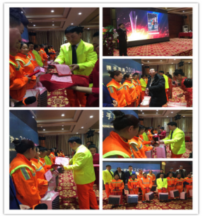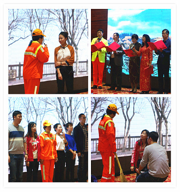 虎滩所员工表演的舞蹈《欢天喜地》,把环卫人对生活的热爱,表现的都很出色,也让我们看到了环卫人台下打硬仗,台上多姿多彩的另一面。三八所林自博所长编写的三句半《工匠精神》紧跟十九大的步伐,把环卫人爱岗敬业奉献社会的精神品质,体现的真实洒脱。三八所女将们的舞蹈《撸起袖子加油干》把环卫工人新时代、新气象用肢体语言展示给大家,也体现出他们热爱自己的工作、不畏艰辛、不惧困难的坚强性格。车队杨华良的儿子还带来了指弹吉他《不忘初心》,王锋女儿的钢琴演奏《彩云追月》都是娴熟、优美、流畅,富有一定难度的表演,给大会添色不少。洁立德环卫简讯编辑组还给大家带来了精心编排的情景剧《美丽的不期而遇》,反映了环卫事业大家有责和环卫工人的善良、担当。让我们在感动之余,还学到了很多环卫工作方面的常识。洁立德的大合唱《革命人永远是年轻》、《共筑中国梦》既有讴歌那激情燃烧的岁月,又有和着时代的节拍为实现中华民族伟大复兴的中国梦而尽绵薄之力的热情,令人振奋。他们整齐的服装,抖擞的精神,让人眼前一亮。除了精彩的节目,会议还加入了抽奖环节,公司为大家准备了各种精美礼品--德国产爱乐仕锅具、餐具、刀具、保温壶、菜板等,让大家欣赏节目之余还可以满载而归,开启2018红红火火的多彩生活。最后,公司年会在一片欢乐和谐的欢歌笑语声中圆满结束。在这里,感谢每一位员工的积极参与,在工作压力非常大的情况下都能够挤时间积极排练。这次年会不但活跃了职工的文化生活,更重要的是很好的展示了员工队伍的精神风貌,也希望通过这次年会,成为推动工作的强劲动力,专心致志地干好2018年的工作。——赵倩