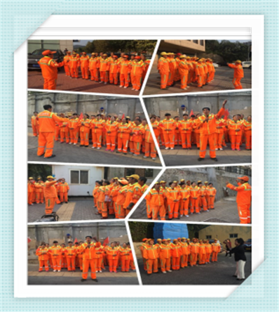 为庆祝建国68周年暨喜迎十九大,公司在班组开展了“环卫工人马路唱响红歌”比赛,比赛于2017年9月29日下午在扫保班组、路段进行。所到之处,集团职能部门员工和班组清扫保洁员工互动,倾情演唱了“没有共产党就没有新中国”、“社会主义好”、“团结就是力量”等多首歌颂祖国歌颂党的经典红歌。每一名工人都唱的很认真很努力,他们用歌声向祖国和党献礼,道出了对党、对祖国、对人民的无限热爱和美好祝愿。这一一首整齐而雄壮的革命歌曲,唱得人热血沸腾,还吸引了许多行人驻足观看。活动最后,经过演唱项目规定的:整齐度、服装及精神面貌、表现力、新颖节奏感、参与人数等评比,鲁迅路班荣获“优秀合唱奖”;中南路班、山林班荣获“优秀组织奖”;山屏班荣获“鼓励奖”。让我们向获奖班表示热烈的祝贺!没获奖的班下次争取,你们的进步也很大,继续努力!——赵倩