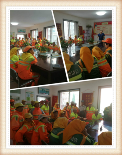 9月9日下午,洁立德虎滩所组织部分一线环卫员工召开作业协调会议,会上,实习经理助理滕日军在会议总结讲话中指出,道路交通安全、环卫作业车辆、安全劳动保护、环卫管理制度等方面要提高意识,并落实在工作中。会议要求,一是安全规范作业。日常作业中严格按照操作规范,主动避开人流和车流高峰,确保作业车辆安全,并且身穿安全劳动保护工装;二是齐心协力抓质量。坚持道路清扫保洁、垃圾点收运要及时,不留卫生死角;三是坚定信念,爱岗敬业。按照市、区环卫职能部门工作部署要求,全面提高环卫工作制度化、规范化、精细化管理。---李冰心